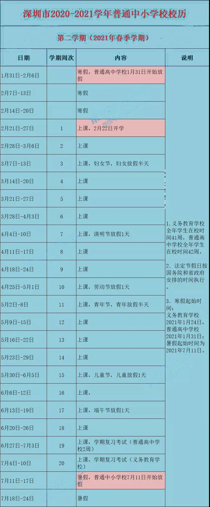 普通高中春季学期20周,2021年2月21日至2月27日为第1周,2月22日开学,暑假从2021年7月11日开始。
