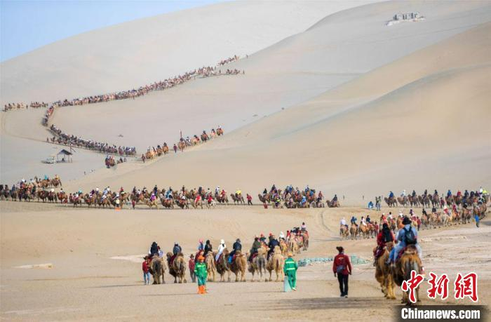 图为5月3日,敦煌鸣沙山月牙泉景区驼队。 张晓亮 摄