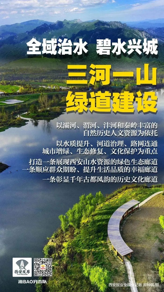 “三河一山”绿道作为“全域治水 碧水兴城”的重要组成部分,以浐灞河、渭河、沣河和秦岭丰富的自然历史人文资源为依托,建设了一条集骑行、步行、观光、休闲等多功能为一体的生态慢行系统,沿途串联了103个生态节点和42个人文历史遗址,规划建设109个休憩驿站,为市民群众提供一个望得见山、看得见水、记得住乡愁的绿色生态长廊。