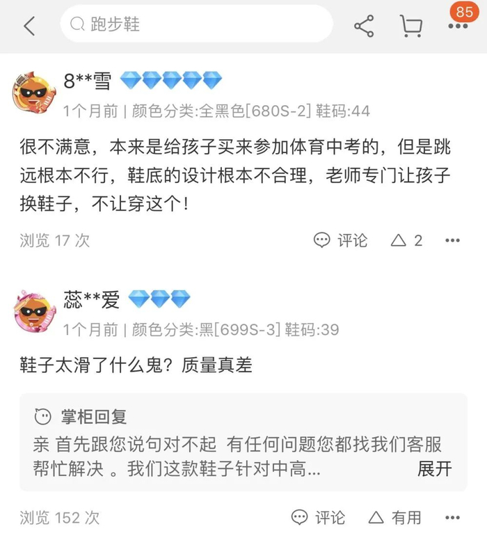 更令人担忧的是,一些中考体测鞋不仅无法达到提分效果,甚至还存在质量问题。有顾客表示:“买来跑了一下,鞋子直接开胶。”还有家长说:“鞋子很硬,正常抬脚走路都不太方便,我家孩子跳绳穿了十几分钟袜子就染上了黑色,体测鞋真是套路满满。”记者打开一款月销3000双体测鞋的淘宝店铺,同样看到有不少顾客评论该款体测鞋“鞋底滑”“不跟脚”“味道大”“网丝容易裂开”。