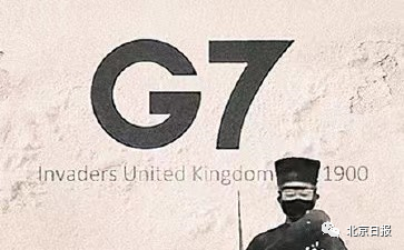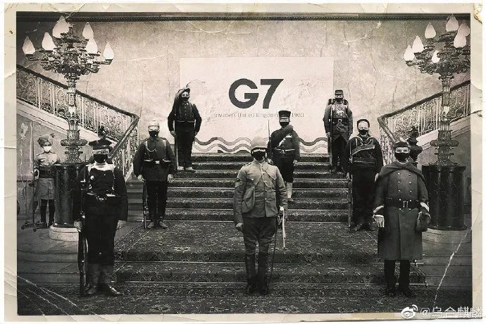 原照片背景板G7下方的文字是United Kingdom 2021,在画作中乌合麒麟把这句改成了Invaders United Kingdom 1900。