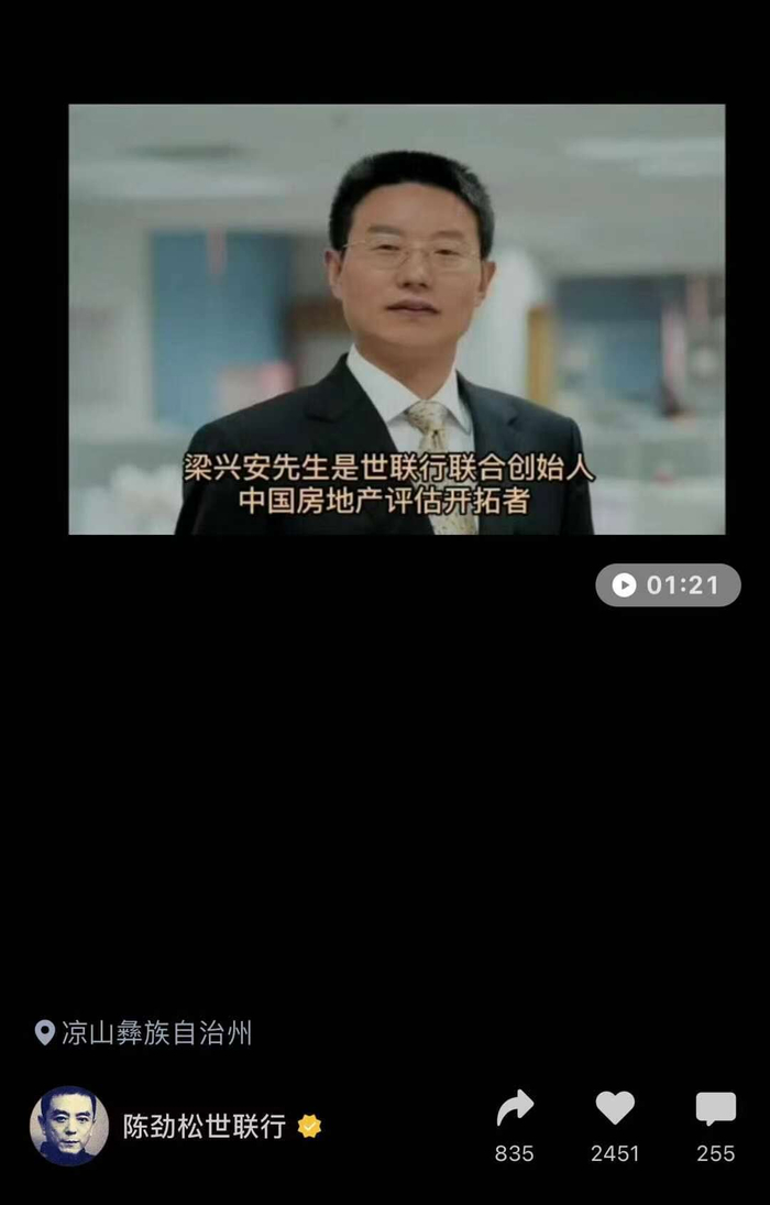 世联行董事长陈劲松在其微信视频号发布一则定位于凉山彝族自治州的短片纪念梁兴安。短片显示,梁兴安是世联行联合创始人,中国房地产评估开拓者,领科教育机构领路人,大凉山公益教育的组织者,不幸在凉山考察途中遇难离世。