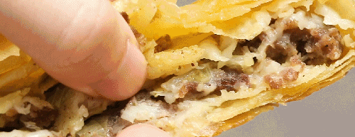 轻轻一掰开,千层的酥皮就酥到掉渣,露出满满牛肉,葱花的加入简直是灵魂的点缀,鲜香扑鼻!