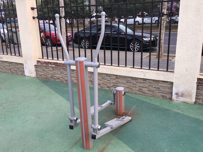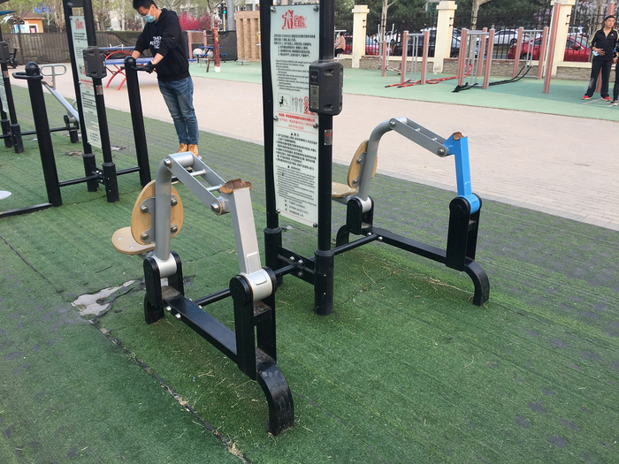 除了明显缺胳膊少腿的,还有一些器材虽然看起来没问题,但也已经没法使用。比如一个可以左右摇摆训练腰部的钟摆器,虽然踏板还在,但踩上去之后发现它会卡在支撑杠上,根本摆动不了。