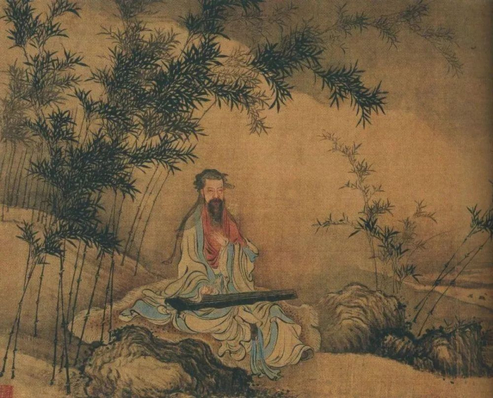 清代画家禹之鼎所绘《幽篁坐啸图》。王维有诗“独坐幽篁里,弹琴复长啸。深林人不知,明月来相照”,营造了一个禅意盎然的意境。在古代士大夫的精神生活中,古琴是不可缺少的。