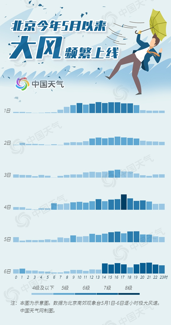 从北京南郊观象台5月1日至6日逐小时的极大风速实况数据来看,几乎每天都出现过5级或以上的阵风,其中有28个时次出现了6级或以上的阵风,最大阵风出现在5月4日下午4点多,为17.8米/秒,风力达到8级。