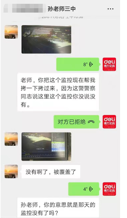 蒋先生说,他相信了孙老师的话,没有当即再查看。2020年11月5日,当蒋先生去派出所查看监控录像时,被告知,在学校拷给派出所的U盘里面,没有1至6楼的那段监控录像。蒋先生随即用微信联系了孙老师。两人聊天记录显示,孙老师说,“拷了的啊”,“都在U盘上”,“这边已经覆盖了”。