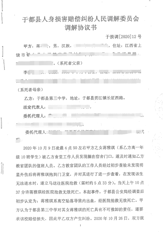 2020年11月1日,经调解,蒋先生夫妇与于都三中签订了赔偿协议。在蒋先生与校方签订的调解协议书中,这样描述小琪送医前的过程: