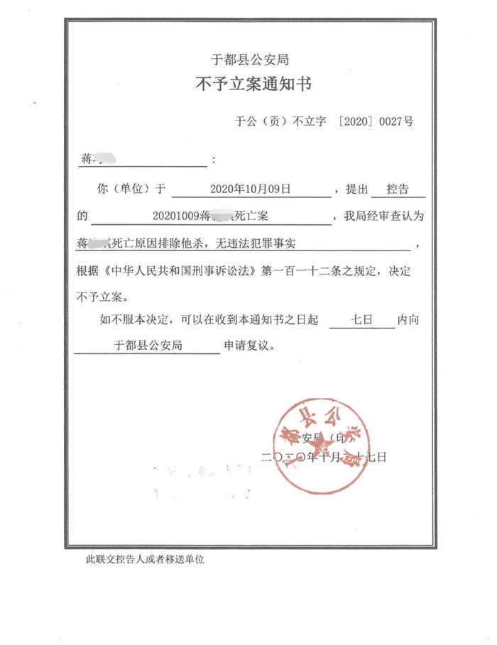 蒋先生说,在女儿死亡近两个月后,2020年12月7日,他才要到了于都县公安局出具的不予立案通知书。通知书显示,蒋先生于2020年10月9日提出控告的小琪死亡案,经审查认为,小琪“死亡原因排除他杀,无违法犯罪事实。”根据刑事诉讼法第一百一十二条之规定,决定不予立案。如不服本决定,可以在收到本通知书之日起,七日内向于都县公安局申请复议。