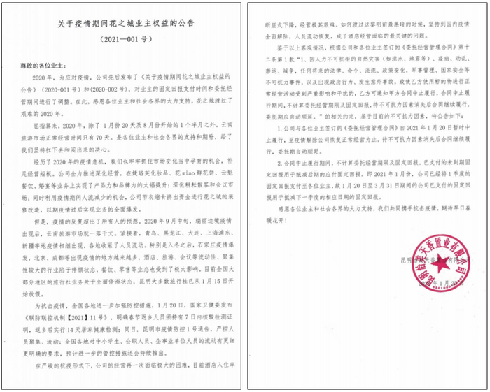 公告中称:“2020年9月中旬,瑞丽边境疫情出现后,云南旅游市场就一落千丈……在严峻的抗疫形式(势)下,公司的经营再一次面临极大的困难,目前酒店入住率断崖式下降,经营极其艰难。”因此,公告提出:“基于目前的不可抗力因素……公司与各位业主签订的委托经营管理合同自2021年1月20日暂时中止履行,至疫情解除公司恢复正常经营为止。待不可抗力因素消失后合同继续履行,委托期自动顺延。”