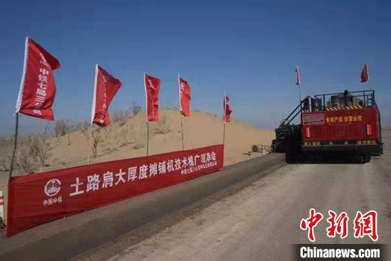 中新网新疆五家渠5月8日电(陶拴科)集“智能、快速、绿色、安全、旅游”等要素的新疆首条沙漠高速公路(S21阿勒泰至乌鲁木齐)正在火热建设中。5月8日,记者探访这条沙漠高速公路一期项目五家渠段建设工地,现场机器轰鸣,一派繁忙。