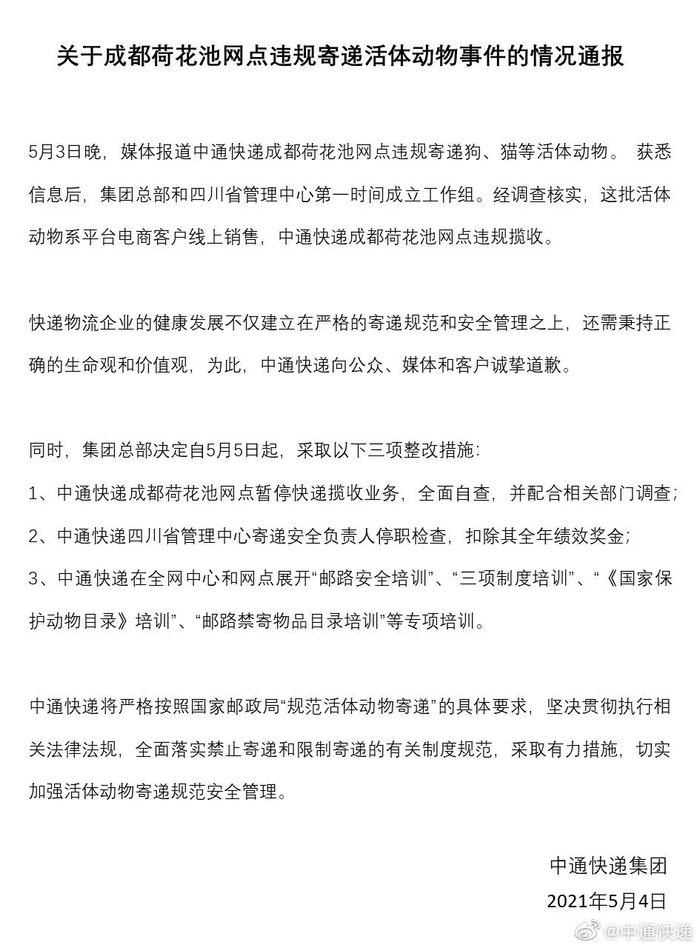 5月4日,中通快递发布致歉声明,并称自5月5日起,采取对涉事网点暂停快递揽收业务,全面自查,在全网中心开展“邮路安全培训”等三项整改措施。同时中通快递表示,切实加强活体动物寄递规范安全管理。