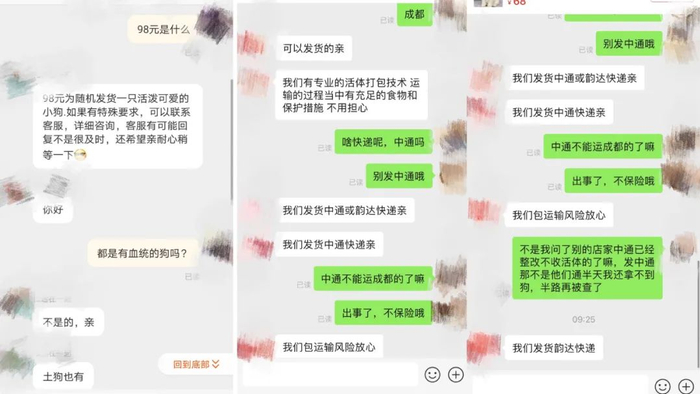 “98元随机发货一只活泼可爱的小狗,”5月6日,一宠物店的客服告诉中国新闻周刊,可发送韵达快递。另一宠物店的客服称,有专业的活体打包技术,可发中通快递或韵达快递,包运输风险,当被问到中通正在整改不收活体后,该客服改口,发韵达快递。