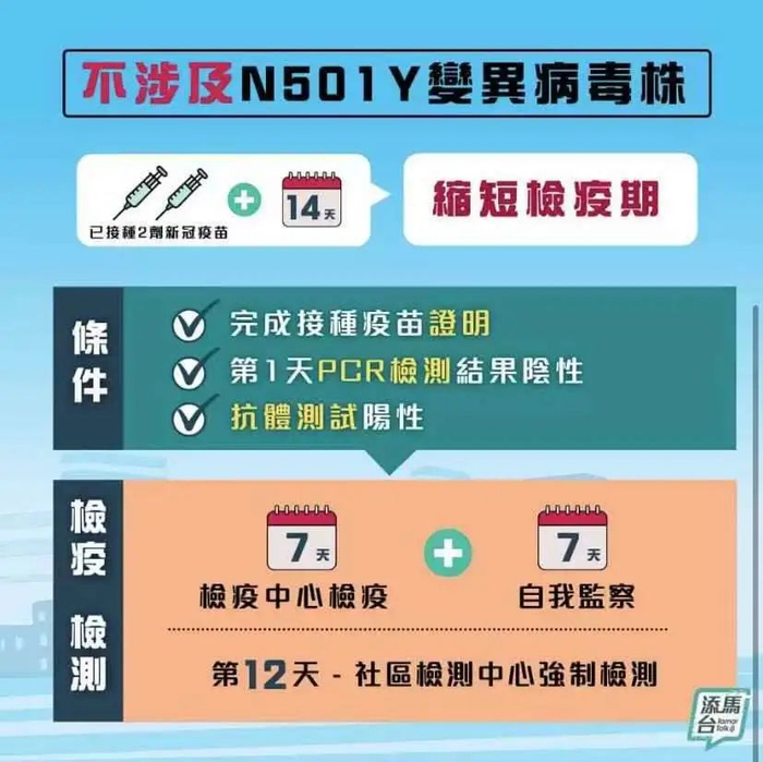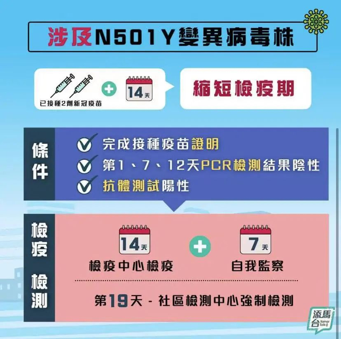 涉及N501Y变异病毒株本地感染确诊个案的密切接触者如符合三项条件,其强制检疫期可由在检疫中心检疫21天缩短至14天,再自我监察七天,并须于第19天在社区检测中心接受强制检测。