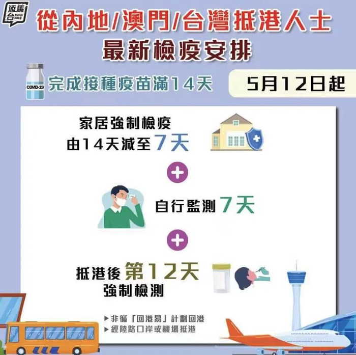 曾逗留在内地、澳门和台湾的抵港人士并非循“回港易”计划回港,如他们已完成接种新冠疫苗,其强制检疫期也由14日减半至七日。他们其后须进行七日自我监察,并于抵港后第12日接受强检。