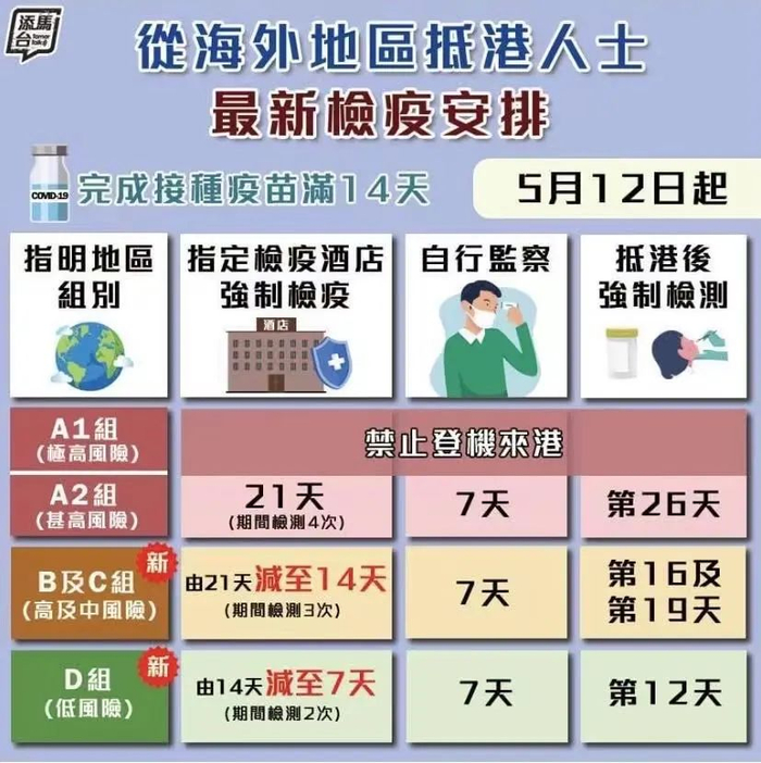 由中、高风险地区到港并已完成接种新冠疫苗人士在指定检疫酒店强制检疫日数,则由21日缩短至14日,另加七日自我监察,并于抵港后第16日和第19日接受强检。
