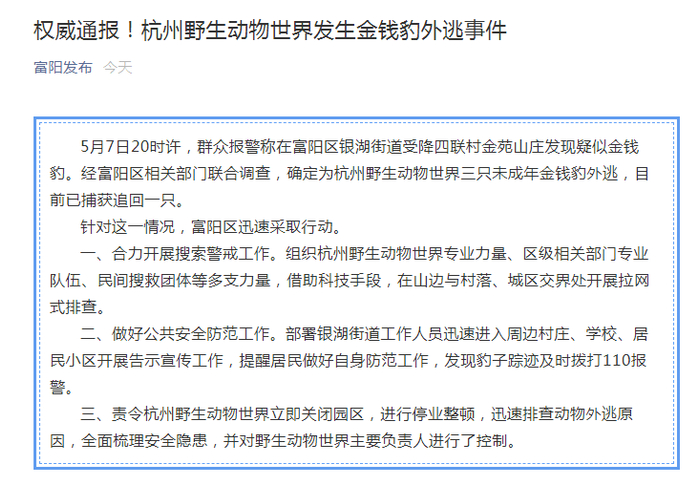 5月7日20时许,群众报警称在富阳区银湖街道受降四联村金苑山庄发现疑似金钱豹。经富阳区相关部门联合调查,确定为杭州野生动物世界3只未成年金钱豹外逃,目前已捕获追回一只。