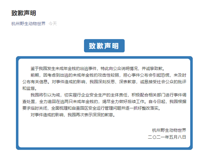 杭州野生动物世界发布关园公告,宣布因园区发生安全问题,需及时处理。