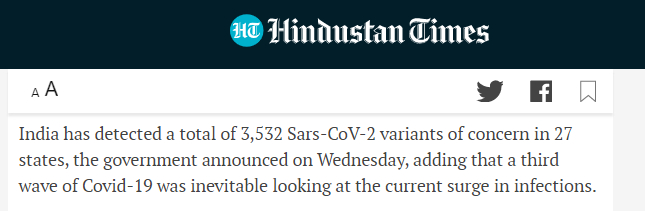 进一步分析后发现,导致翻译出现误差的可能是英文中的这个叫做“variants of concern”的词组。由于诸如《印度斯坦时报》等印度媒体在他们的报道中没有《印度快报》写得这么详细,而是简单地写了一个在印度27个邦里检测出了3532个“variants of concern”,所以国内在翻译时很容易把会这个“3532 variants of concern”当成了“3532个变种毒株”。