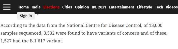 这段翻译成中文后其实是在说:根据印度国家疾病控制中心的数据,印度对1.3万个样本进行了基因测序,发现其中有3532个携带主要的新冠病毒变种毒株,这其中有1527个携带的是被印度发现的B.1.617这种双重突变毒株。