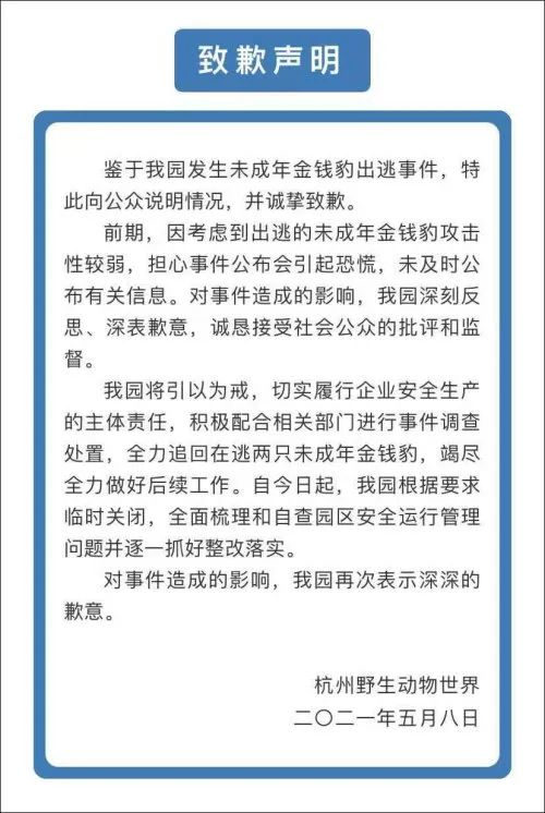 杭州野生动物世界发布致歉声明称,前期考虑到出逃的未成年金钱豹攻击性较弱,担心引起恐慌,故未及时公布有关信息。对事件造成的影响,该园深刻反思、深表歉意。