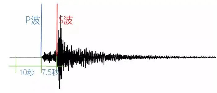 (震中距60千米,震源深度10千米,P波传到约10秒,S波传到约17.5秒,S波和P波到时差为7.5秒。其S波幅值约为P波的5倍,能量约为P波的25倍)