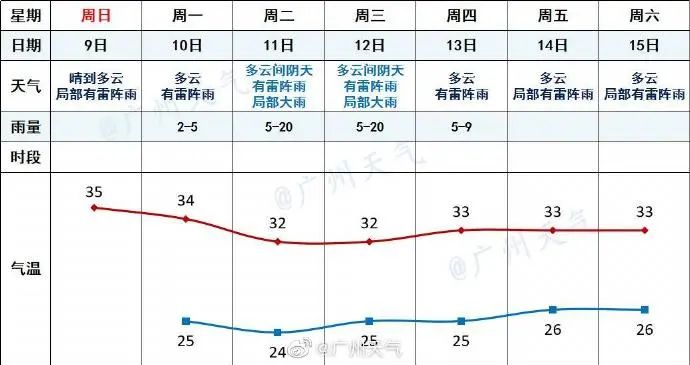 10日,粤北、粤西、珠三角部分市县有(雷)阵雨局部暴雨,其余市县多云局部有阵雨。最高气温:粤北的北部市县、沿海市县29℃~32℃,其余市县33℃~35℃。