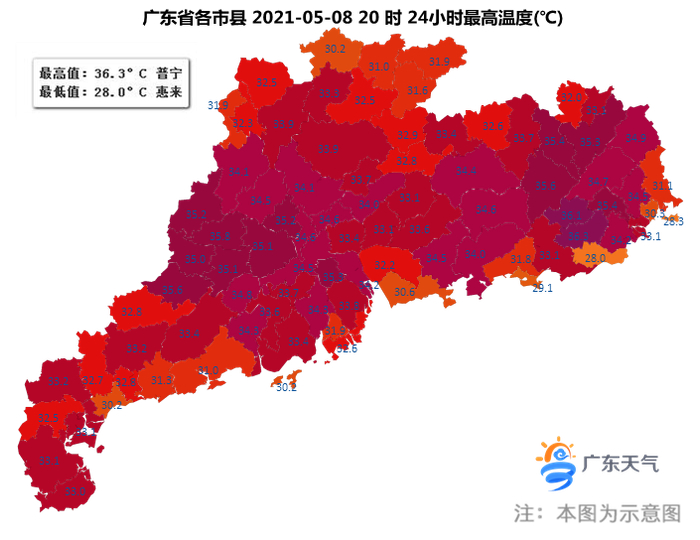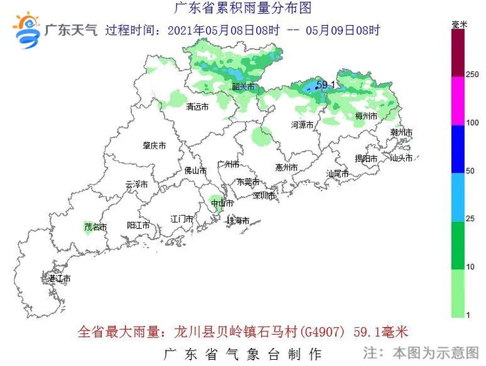 8日白天到9日早晨,粤北的北部市县出现了中到强雷雨局部暴雨、8级-10级短时大风和小冰雹,其余市县多云为主局部出现了(雷)阵雨。9日早晨最低气温分布:珠三角、沿海市县介于24℃~26℃,其余市县介于21℃~23℃。