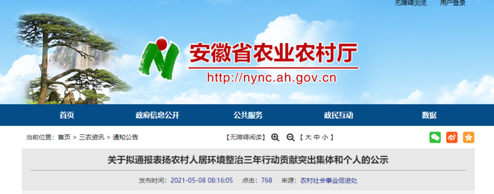 根据《中共安徽省委农村工作领导小组办公室关于推选农村人居环境整治三年行动贡献突出的集体和个人的通知》(皖农工办函〔2021〕15号),在各市推荐、省级审核的基础上,拟对三年行动期间贡献突出的合肥市农业农村局等50个集体、叶群慧等200名个人予以通报表扬。
