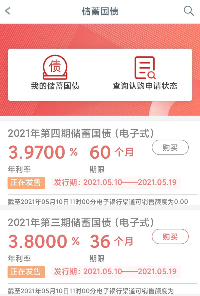 以中国工商银行为例,在手机下载、安装、登录“中国工商银行”APP后,首页点开“储蓄国债”图标,即可进入储蓄国债购买页面,选择正在发售的国债即可购买。截至上午11时,中国工商银行第四期储蓄国债(电子式)电子银行可销售额度已为0。