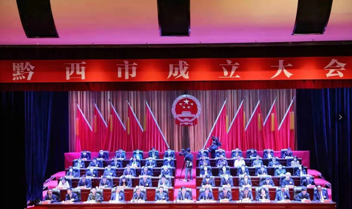 10日上午9时40分,黔西市成立大会在黔西水西大剧院举行,毕节市四大班子主要领导、黔西市四大班子成员、市直相关单位参加成立大会,省民政厅一级巡视员杨亚军宣读了《省人民政府关于撤销黔西县设立县级黔西市的通知》,大会邀请了退休老同志代表、党代表、驻军代表、村干部代表、学生代表等人士参加。