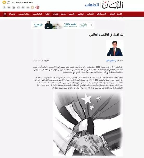 5月7日,阿联酋主流媒体《宣言报》刊登李旭航总领事的署名文章《为世界经济播种希望》。全文如下: