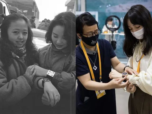这是一张拼版照片:左图为1992年,各式色彩艳丽、造型别致的大手表倍受北京姑娘的青睐(新华社记者张燕辉 摄);右图为2021年5月8日,观众在海南举行的首届中国国际消费品博览会时尚生活展区,试戴新发布的上海牌手表(新华社记者金立旺 摄)。新华社发