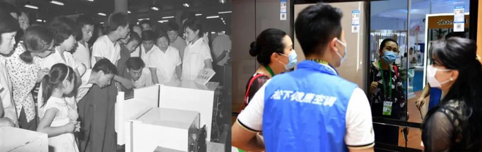 这是一张拼版照片:左图为1980年,顾客在北京西单商场选购日本进口的电冰箱(新华社记者卢琰源 摄);右图为2021年5月7日,观众在海南举行的首届中国国际消费品博览会旅居生活/消费服务展区了解电冰箱(新华社记者郭程 摄)。新华社发