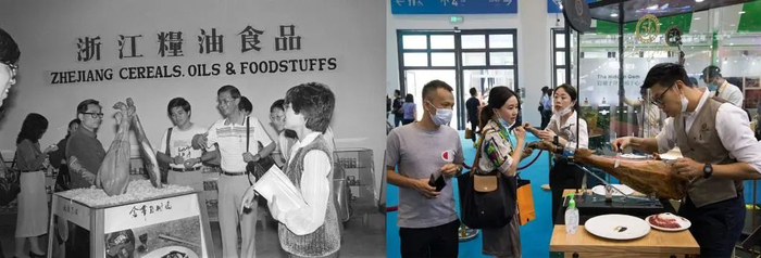 这是一张拼版照片:左图为1983年,港澳记者在了解金华火腿(新华社记者吴元柳 摄);右图为2021年5月8日,在海南举行的首届中国国际消费品博览会高端食品保健品展区,观展者在品尝西班牙火腿(新华社记者金立旺 摄)。新华社发