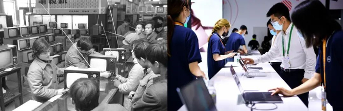 这是一张拼版照片:左图为1980年春节前夕,顾客在上海第一百货商店选购电视机(新华社记者张平 摄);右图为2021年5月7日,观众在海南举行的首届中国国际消费品博览会旅居生活/消费服务展区选购电脑(新华社记者郭程 摄)。新华社发
