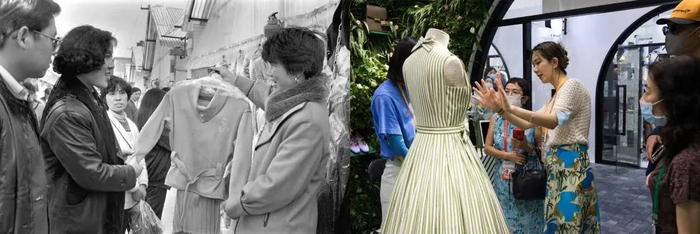 这是一张拼版照片:左图为1994年,在北京丰台区“京温工业品批发市场”,人们在选购时装(新华社记者 谭进摄);右图为2021年5月8日,在海南举行的首届中国国际消费品博览会时尚生活展区法国馆,一件来自法国的时装吸引观展者的注意(新华社记者金立旺 摄)。新华社发