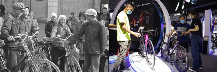 这是一张拼版照片:左图为1982年,山东省宁津县杜集公社李镇大队社员高高兴兴地买回新自行车(新华社记者李锦 摄);右图为2021年5月8日,在海南举行的首届中国国际消费品博览会旅居生活/消费服务展区,观众在体验时尚运动自行车(新华社记者金立旺 摄)。新华社发