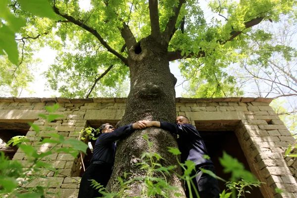 村里有一棵高大的皂角树,需要两个成年人才能将它环抱