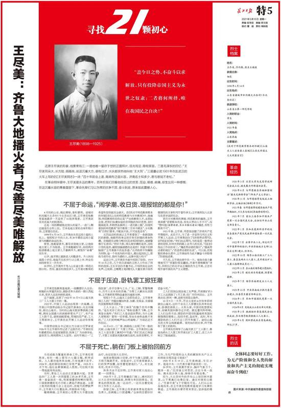 他将自己的名字由王瑞俊改为王尽美,立志实现尽善尽美的共产主义理想。1922年组织山海关铁工厂工人卧轨罢工,视死如归的壮举换来罢工胜利。后因肺结核病逝,是中共一大代表中最早辞世的一位。