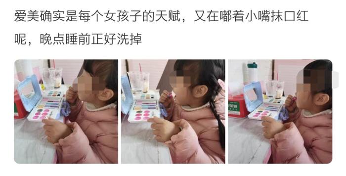评论区里,给孩子买化妆品的家长多出于两个原因:孩子“爱美”总想用妈妈的化妆品,或者看到电视上或者小伙伴有人在用。