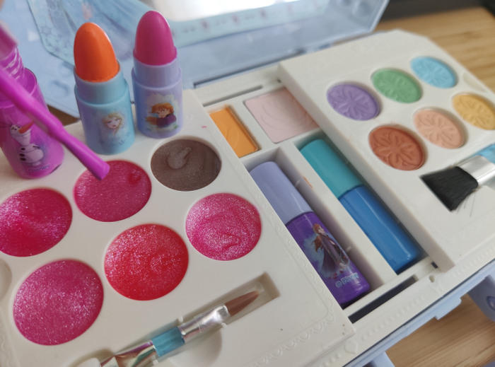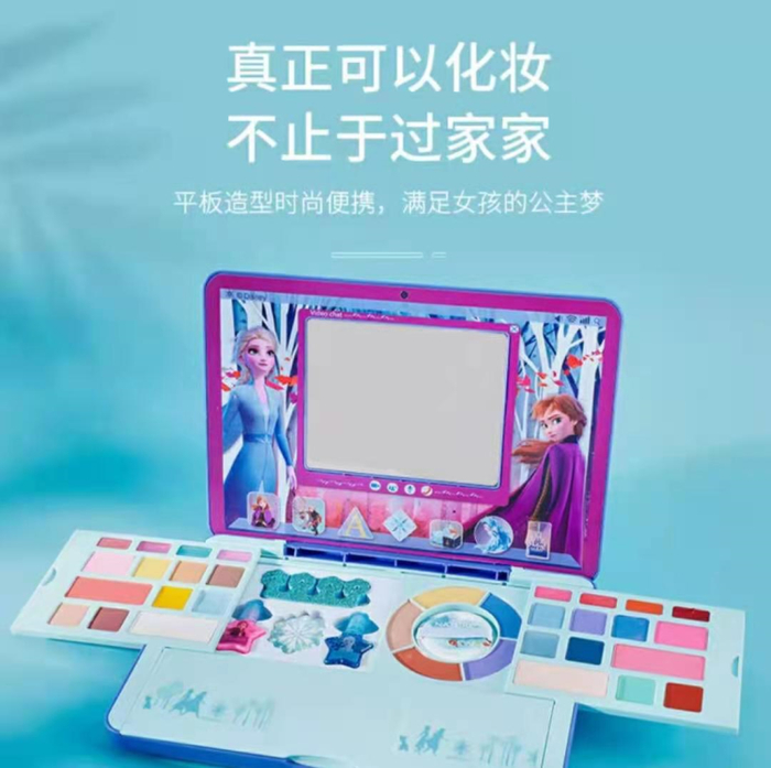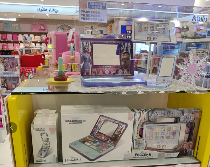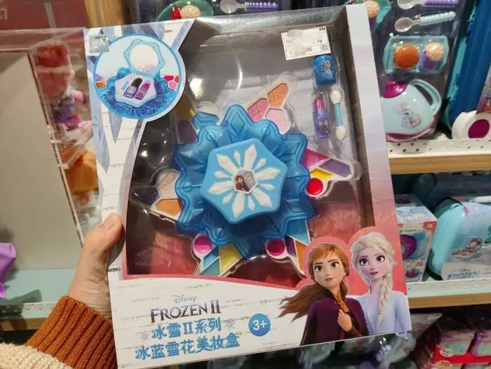 这些化妆盒大多以冰雪奇缘、凯蒂猫等儿童喜爱的动画形象作为包装