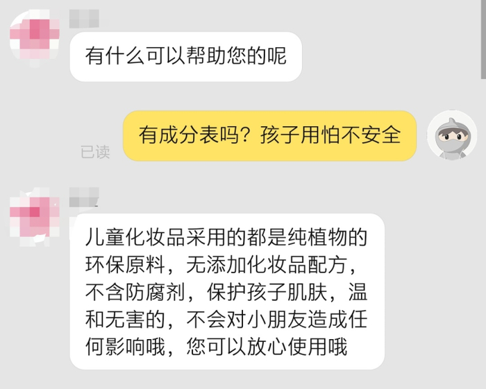 当记者以担心安全问题为由向客服咨询时,对方回答:“儿童化妆品采用的都是纯植物环保原料,无添加化妆品配方,不含防腐剂,保护孩子肌肤,温和无害,不会对小朋友造成任何影响,可以放心使用。”