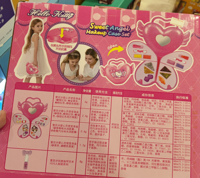 “这应该是给芭比娃娃化妆用的吧?”一位店员在向记者介绍产品时,并不能讲清楚这些套盒的用途,她建议保险起见,不要给孩子脸上用,可以给娃娃化妆。