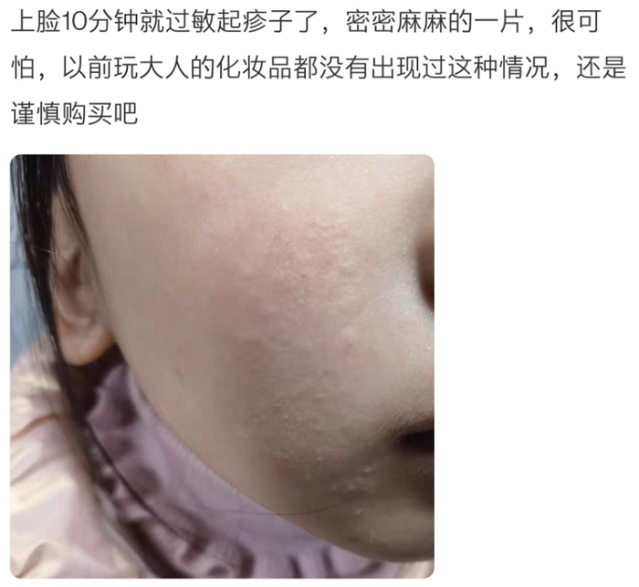 上脸10分钟就过敏起疹子了,密密麻麻一片,很可怕,以前玩大人的化妆品都没出现过这种情况,还是谨慎购买吧。”