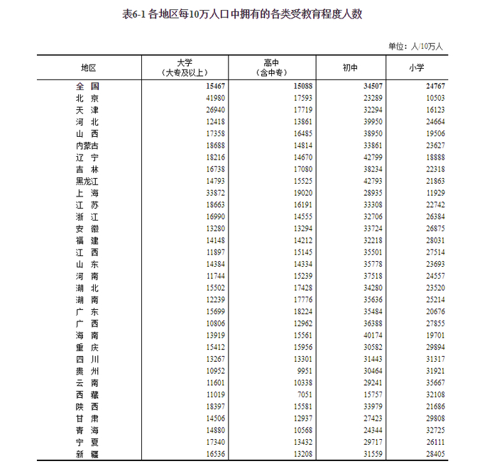 4、在受教育方面,每10万人口中拥有高中(含中专)教育的人数13208,初中教育人数31559,小学教育人数28405。
