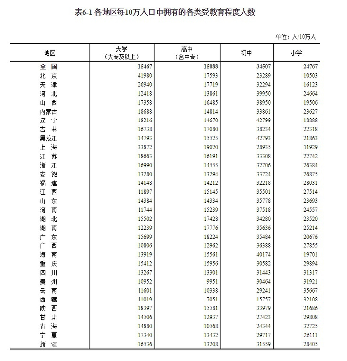 4、在受教育方面,每10万人口中拥有大学(大专及以上)教育程度的为14148人,高中(含中专)教育程度的为14212人,,初中教育程度为32218人,小学教育程度为28031人。