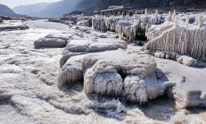游人在陕西壶口瀑布景区观赏“冰瀑玉壶”景观。陶明摄(新华社)