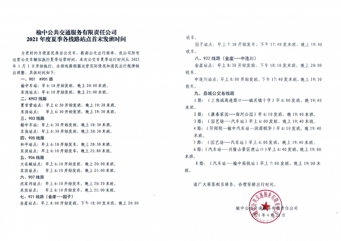 随着天气转暖,白天时间变长,为方便市民出行,兰州市榆中公共交通服务有限责任公司所有运营公交车辆已执行夏季运营时间。全部线路根据市民出行和实际运行情况做出调整,具体时间如下: