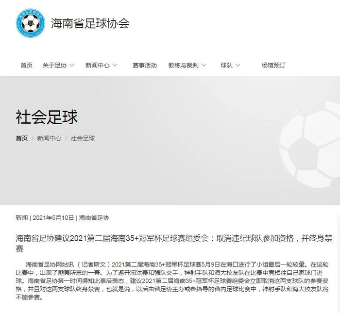 在得知此事后,海南省足协第一时间表态,建议2021第二届海南35+冠军杯足球赛组委会立即取消这两支球队的参赛资格,并且对这两支球队终身禁赛,也就是说,以后由省足协主办或者指导的省内足球比赛中,神射手队和海大校友队将不能参赛。